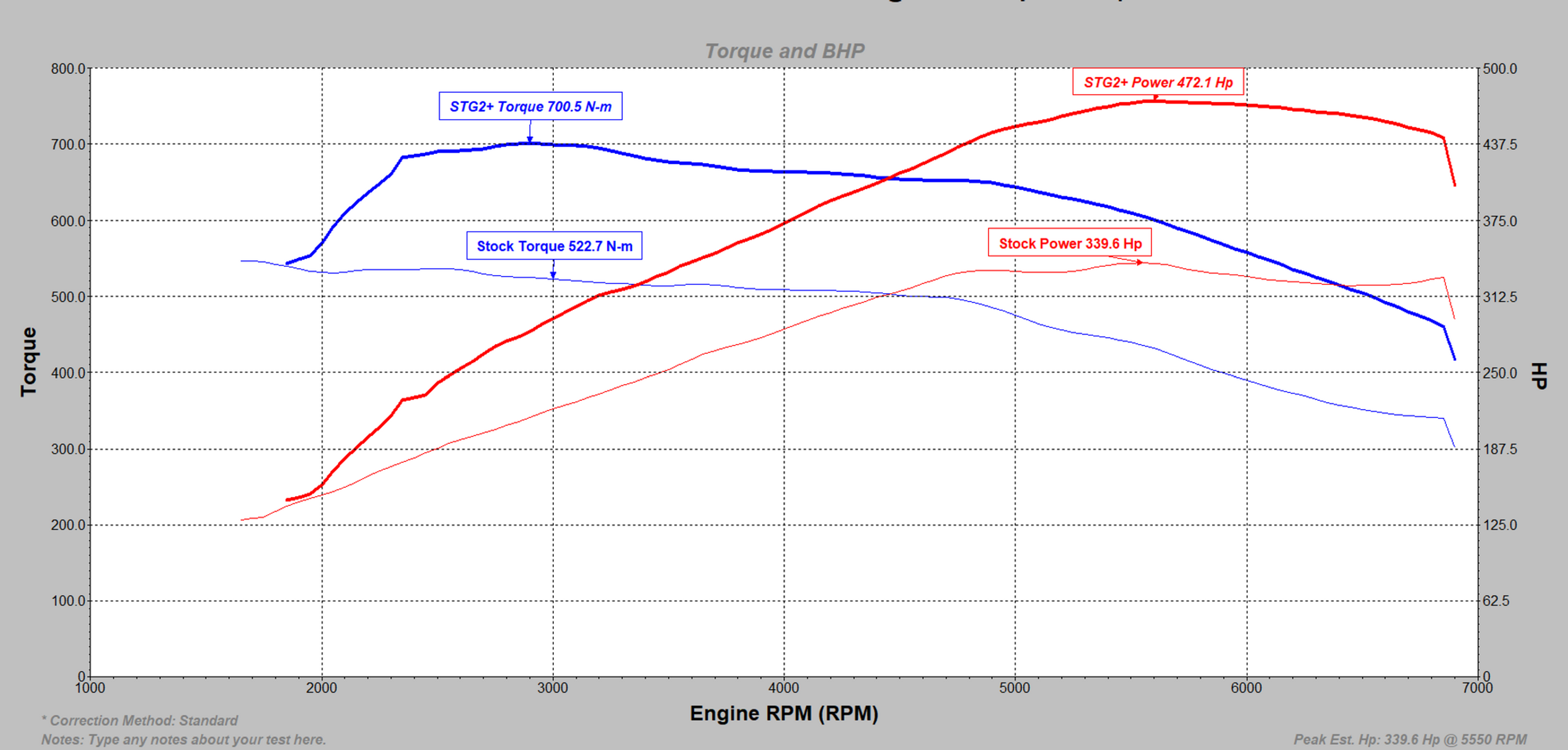 STG 2+ power is increased to 470+BHP and 700-720NM of torque when using 99 RON fuel.